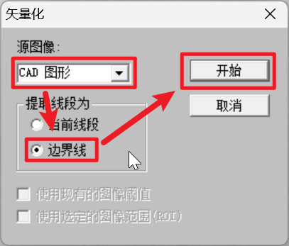 3.将灰度图转换为矢量图,依次点击:矢量-自动矢量化-设置源图像为CAD,提取线段为边界线-开始;