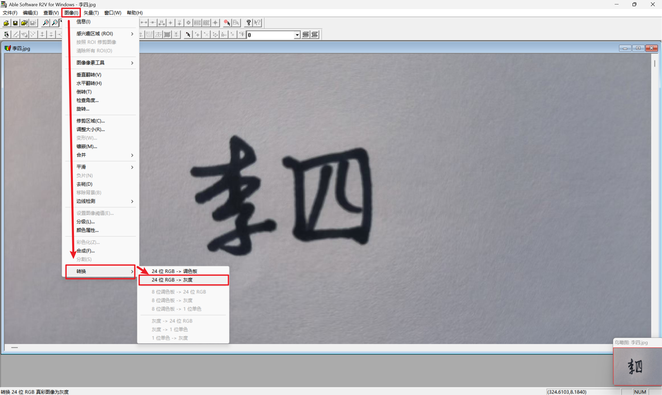 2.将照片转换为灰度,依次点击:图像-转换-24位RGB-> 灰度;